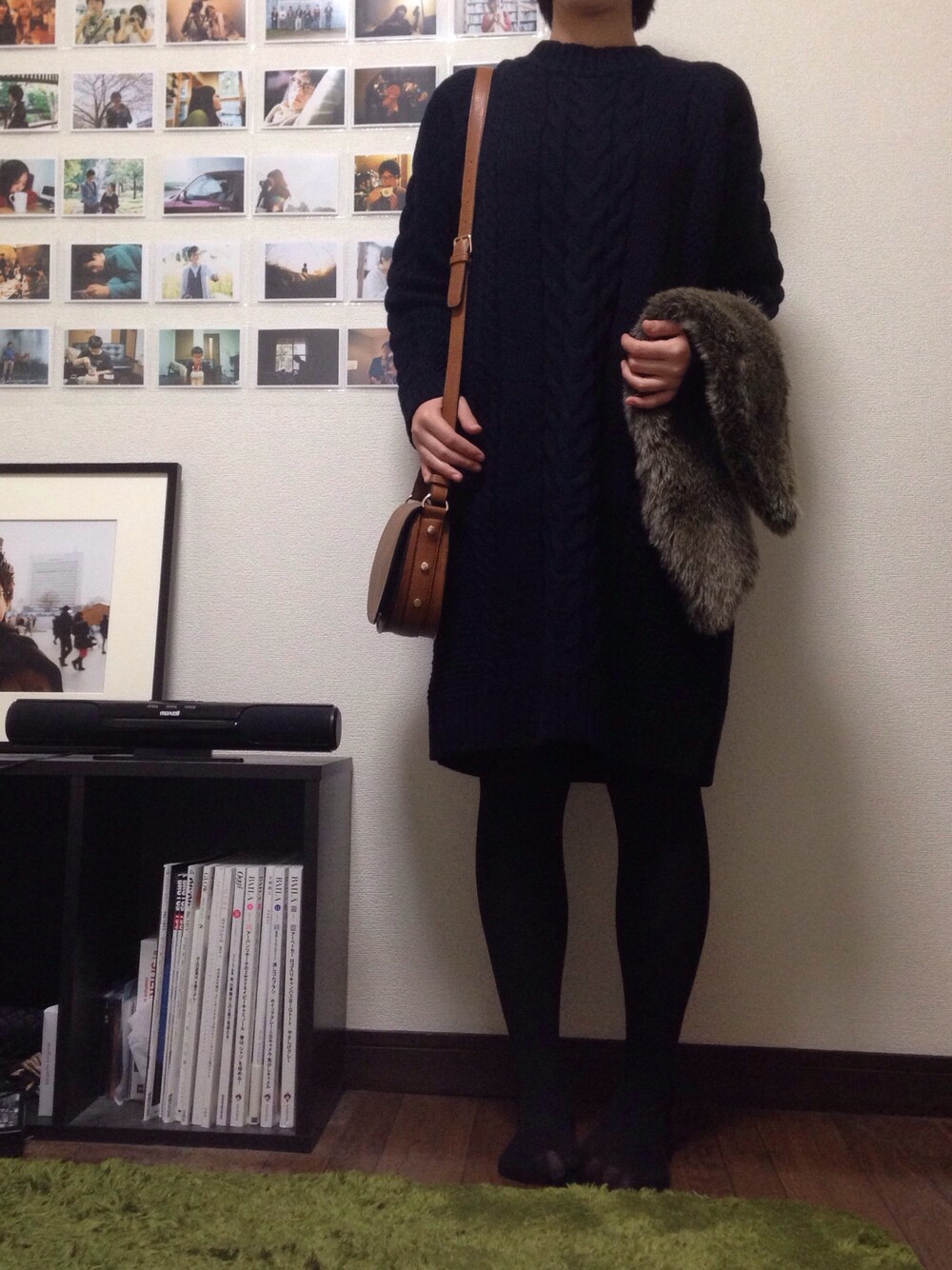 ブラウン系のショルダーバッグ、ブルー系のワンピースを着用したレディースの秋コーディネートの1枚目の写真