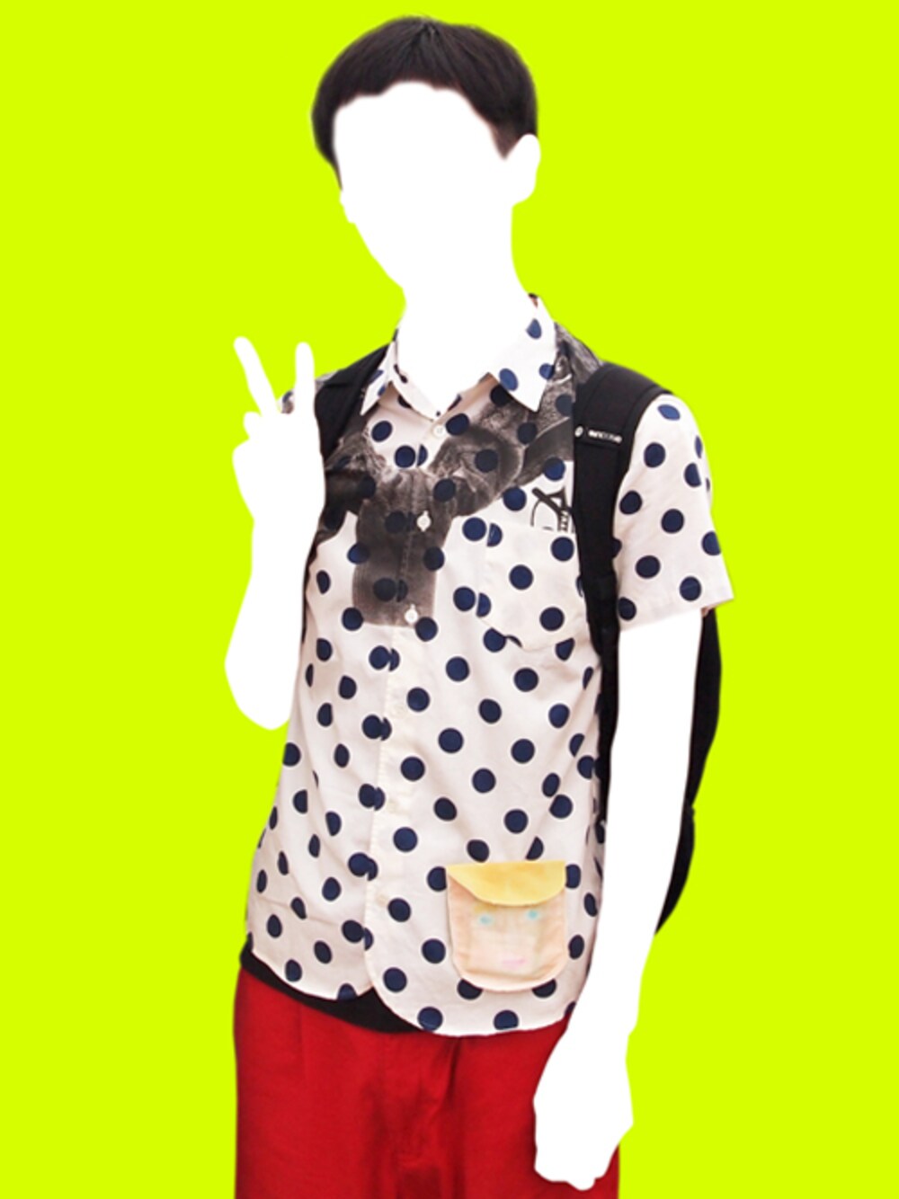 少し前のお休みとき***** 眼鏡もプロデューサーまきのはおりもプリントなのがお気に入りです 前についているお顔はバッヂじゃなくてポケット*** 金沢21世紀美術館で買ったお気に入り。 切符いれたりに便利です!