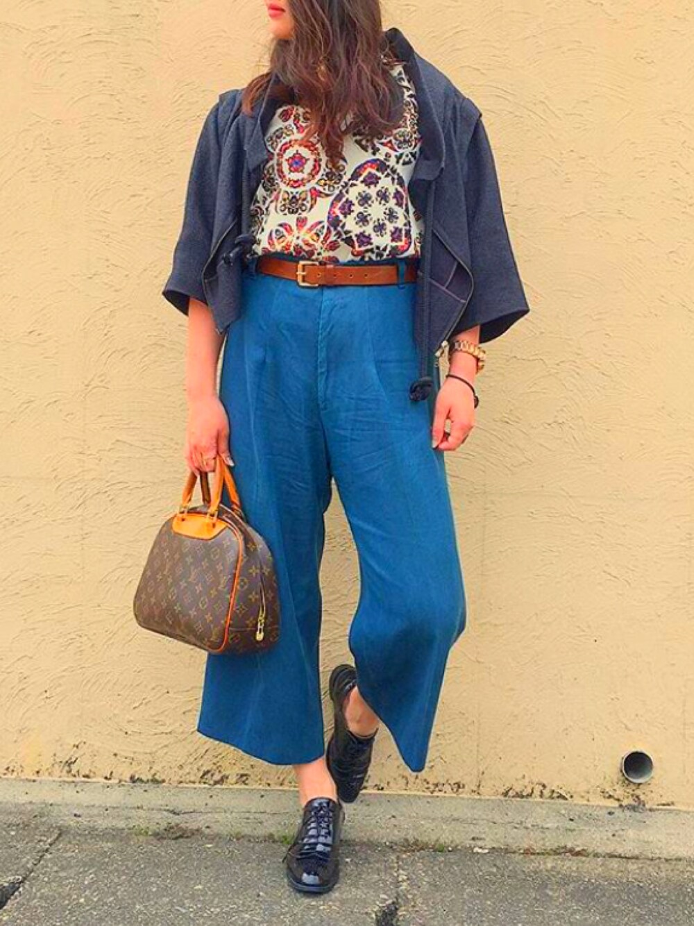 ブルー系のデニムパンツ、ブラック系のジャケット/アウターを着用したレディースの秋コーディネートの1枚目の写真