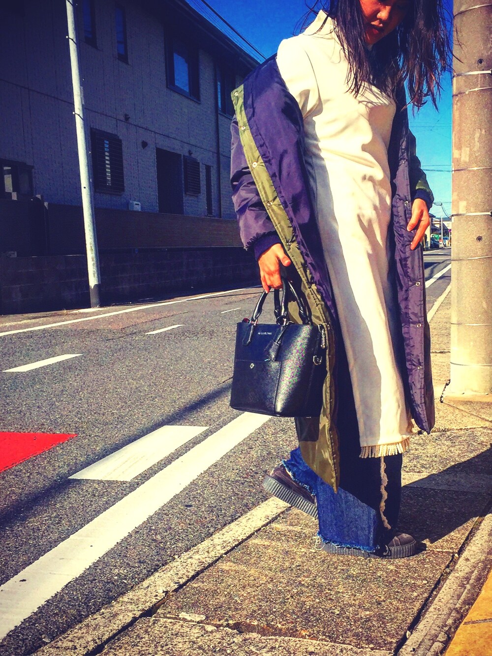 グレー系のスニーカーを着用したレディースの冬コーディネートの1枚目の写真