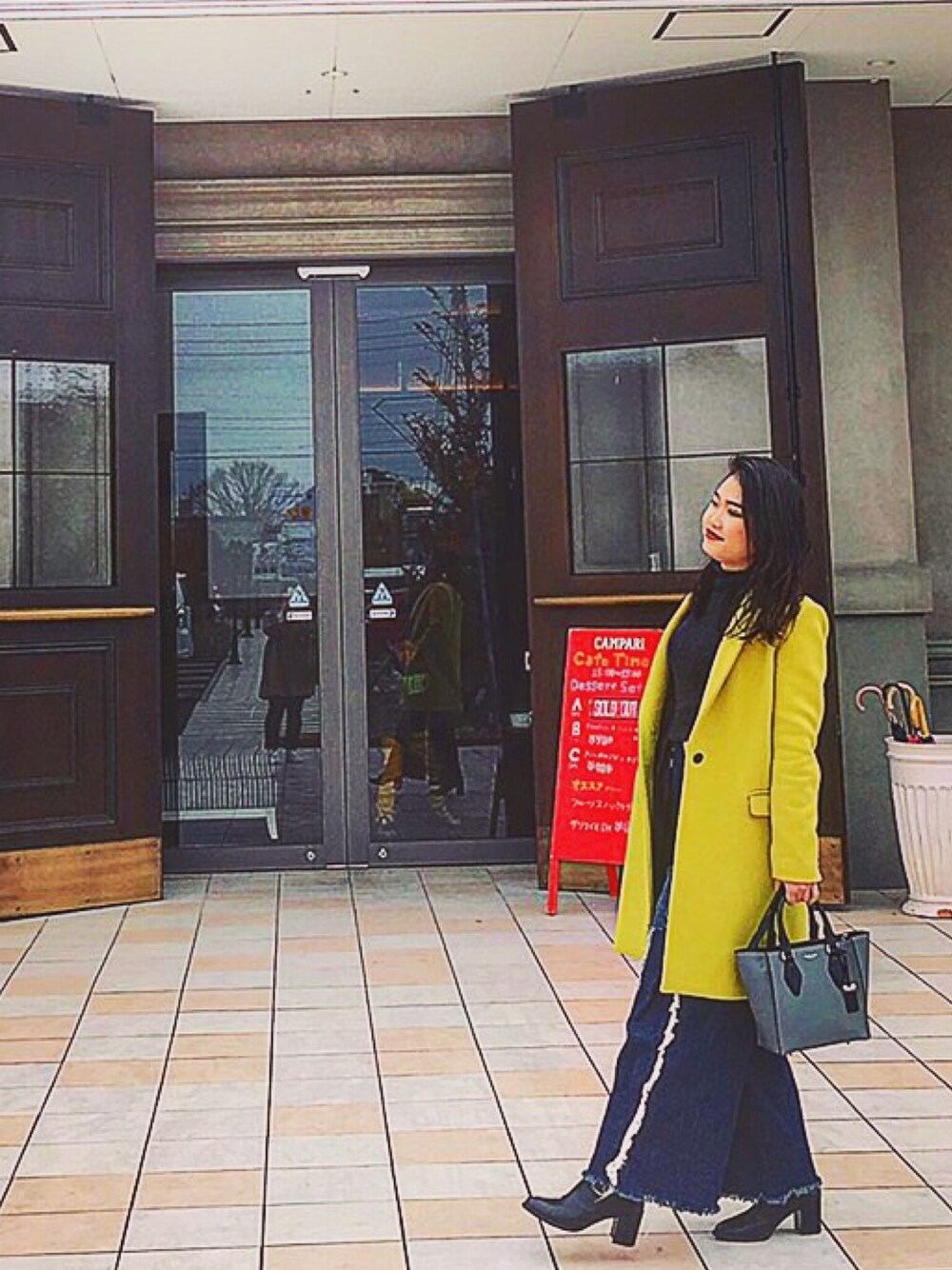 イエロー系のトレンチコートを着用したレディースの冬コーディネートの1枚目の写真