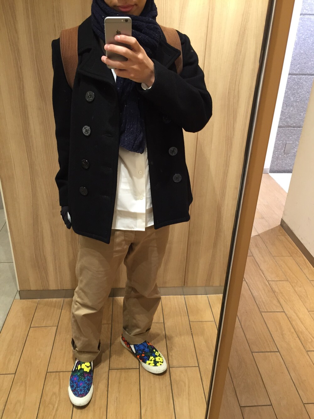 厚手のマフラーで寒さ対策! ピーコートの襟立ててボタンしめれば、完全防備なんですがそこまではしませんでした笑