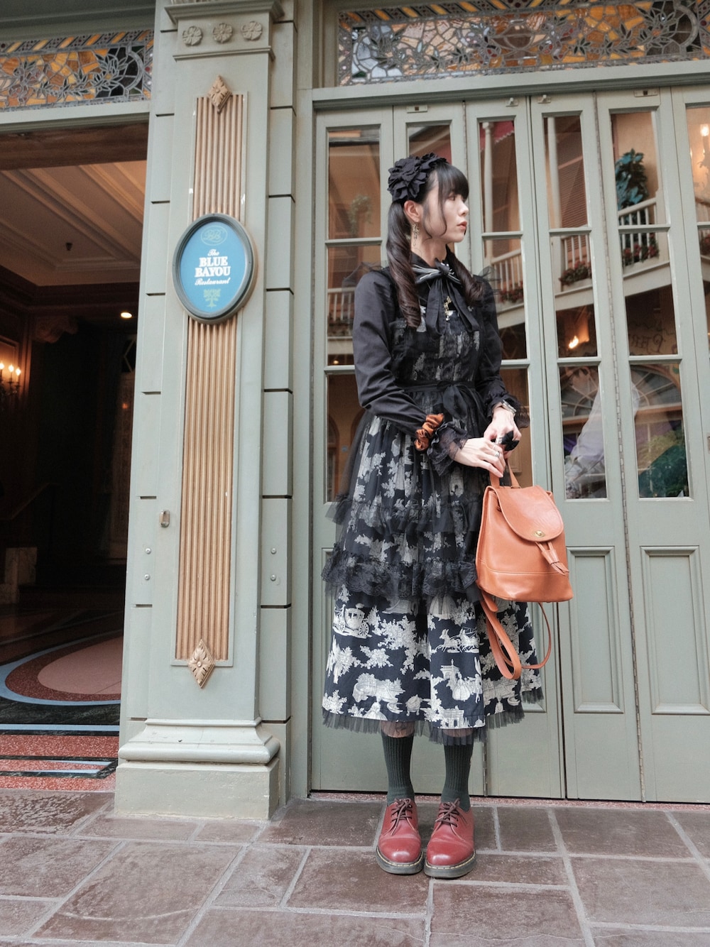 暑すぎでした!! ホーンテッドマンションのキャストさんイメージでロングスカートと短めのエプロン。ジャックのネクタイデザインのパッチンは現地調達です。黒いメリージェーンを履くつもりでいたのですが、急いで出てきたら間違えてしまい午前中落ち込んでいました……黒が良かったんだ……そのために緑の靴下履いたのに……。