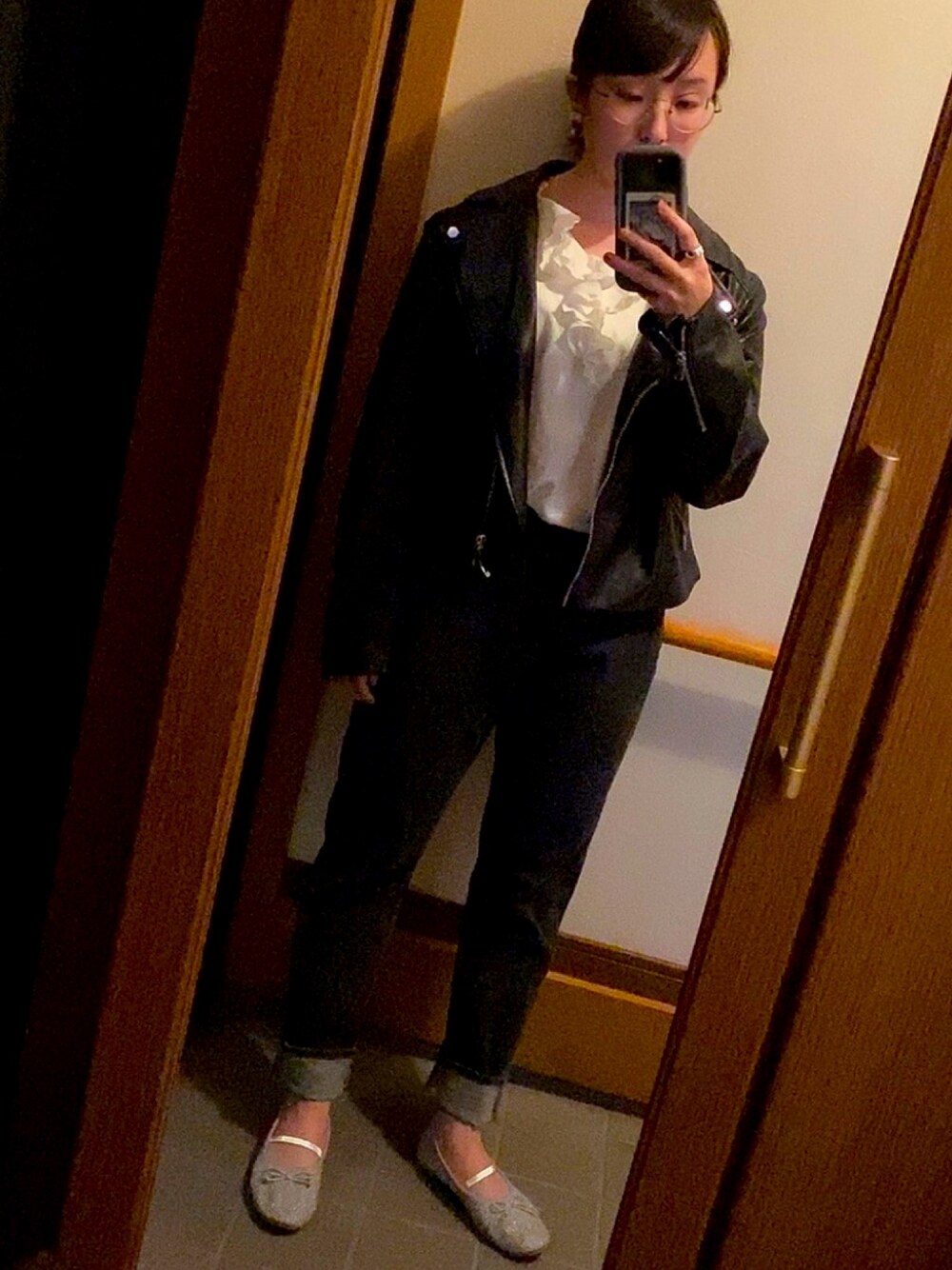 白いブラウスに黒っぽいデニムを合わせると一気にデニムがキレイめアイテムに変わりますよね。 シルバーのバレーシューズも白感覚で使えるので気に入ってはいてます🕊