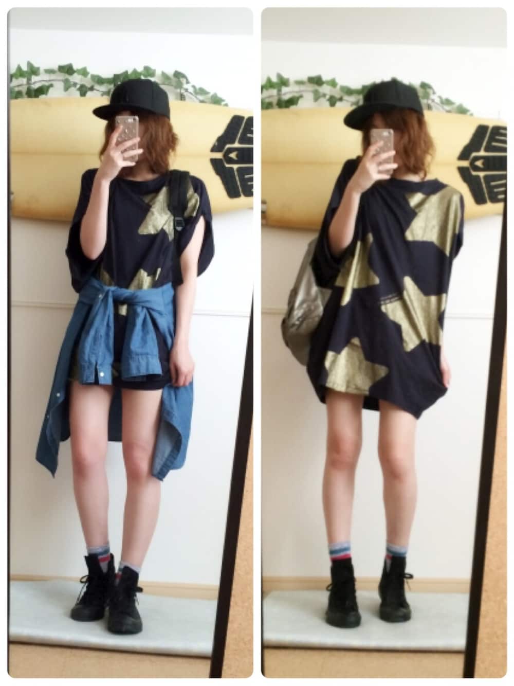 ワンピース:mercibeaucoup, シャツ:UNIQLO ソックス:靴下屋 キャップ:H&M リュック:OUTDOOR このTシャツワンピは短めなので 下にショートパンツ履きます。 暑い…(´Д`)