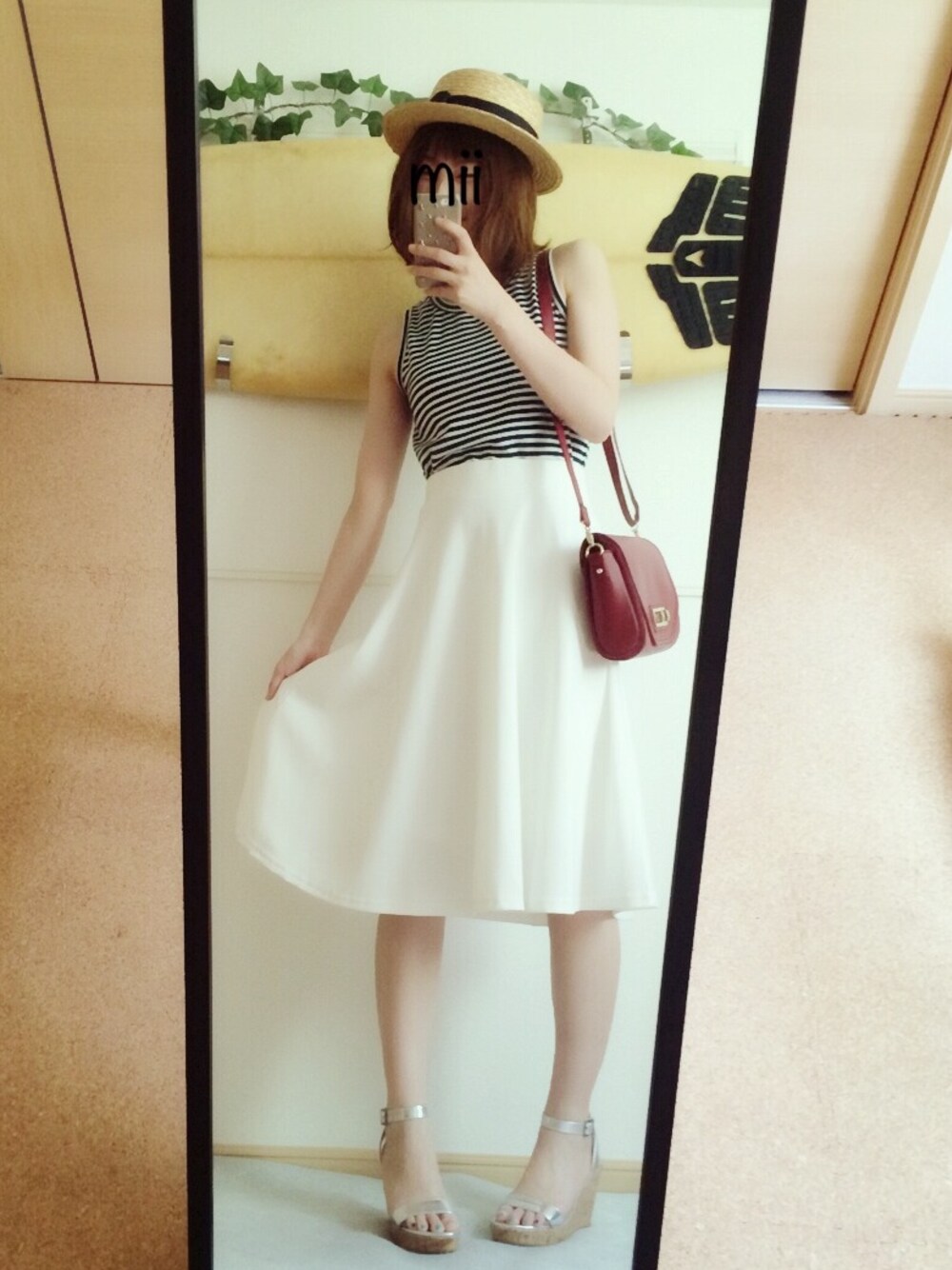 スカート:GALSTAR 帽子:ROPE' バッグ:used いつもセーブ、フォロー、コメントありがとうございます☺︎ 帽子とボーダーで視線を上に。 さらにスカートをハイウエストで着て ヒールサンダルを履くと 足が長く見える気がします。 前髪じぶんで切ったら切りすぎた件(๑¯ω¯๑)