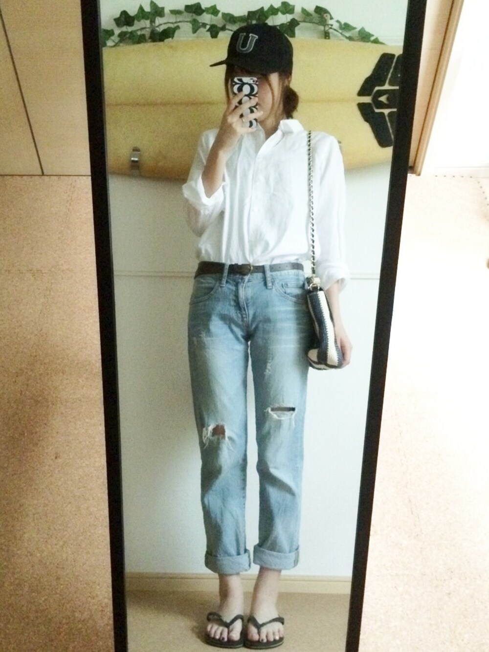 デニム、ベルト:UNIQLO おとといのコーデ。 ちょっと肌寒かったのでリネンシャツにしました。 リネンシャツ、今年初めて買ったけど 風通しもよくて着心地良いですね(⌯¤̴̶̷̀ω¤̴̶̷́)✧ パンプスにしようと思ったけど、 雨ひどかったのでやめました。 そしてビーサンにしましたー。