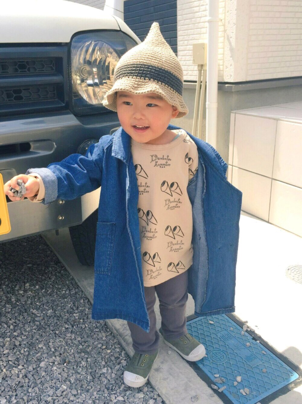 デニムのロングジャケット母もお揃いっぽいの欲しいよう。 走るとマントみたいになびくので喜んでおります。 手に固く握りしめているのは石ころです。 早くポイして、これからIKEAにいくよー(*´◒`*) ひろみ郷なみにはだけておりますが… 中のカットソーが見えるからいっか。 ジャパーン\(^o^)/