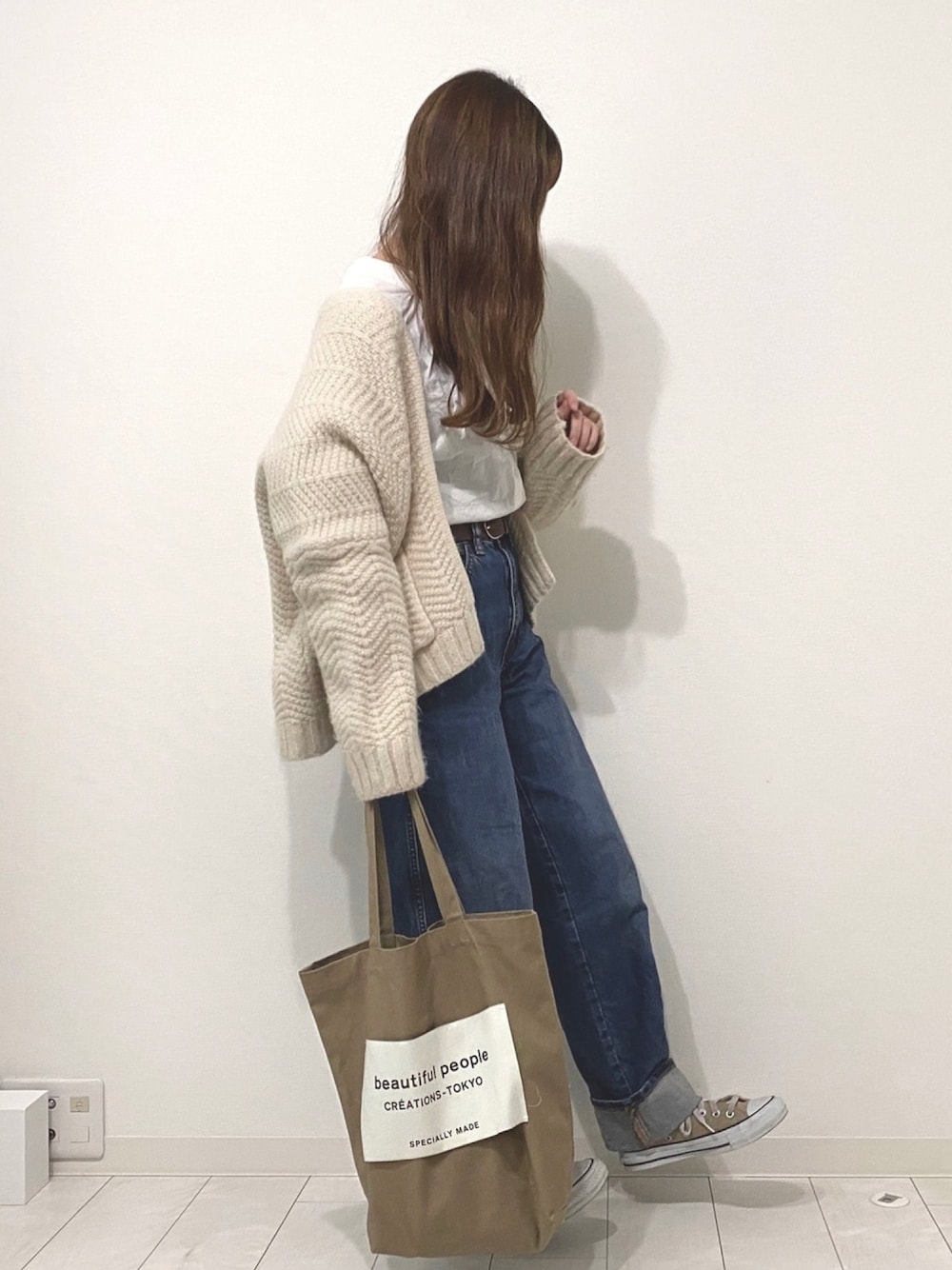 mero *のカーディガン/ボレロ「モッチリとした質感◆ルーズシルエット両ポケット付きドロップショルダー長袖ニットカーディガン」を使ったコーディネート