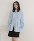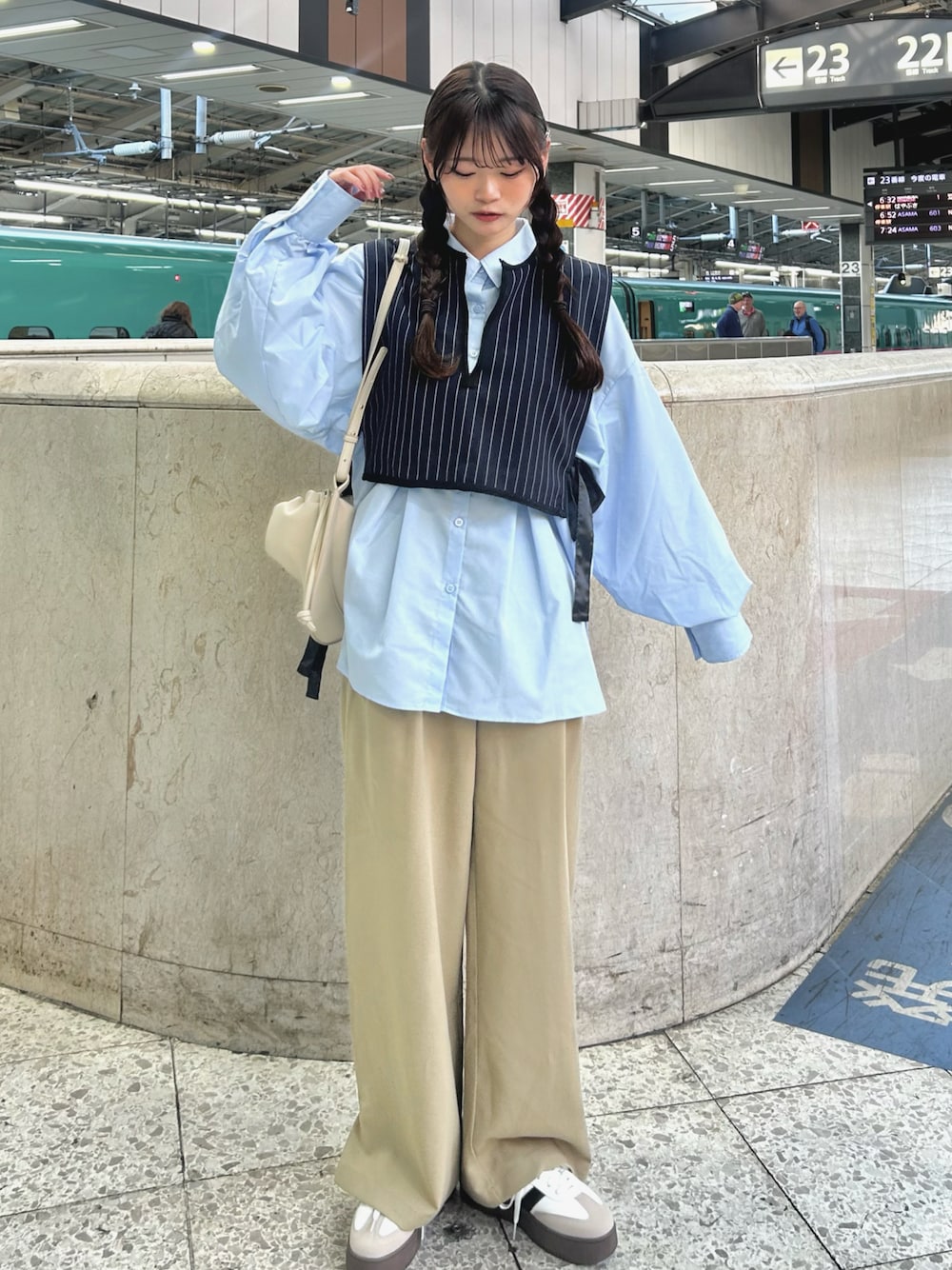 ブルーシャツ × ベージュパンツは王道可愛い春コーデ🙂↕️🙂↕️ ネイビーを入れたら印象が締まる!