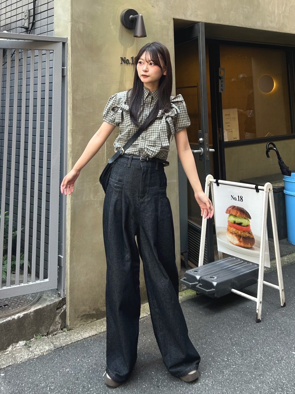 さわち / 小泉 沙和のシャツ/ブラウス「[UNE ORIGINAL]ショルダーパフサイドピンタックユニークリボンチェックブラウスシャツ」を使ったコーディネート