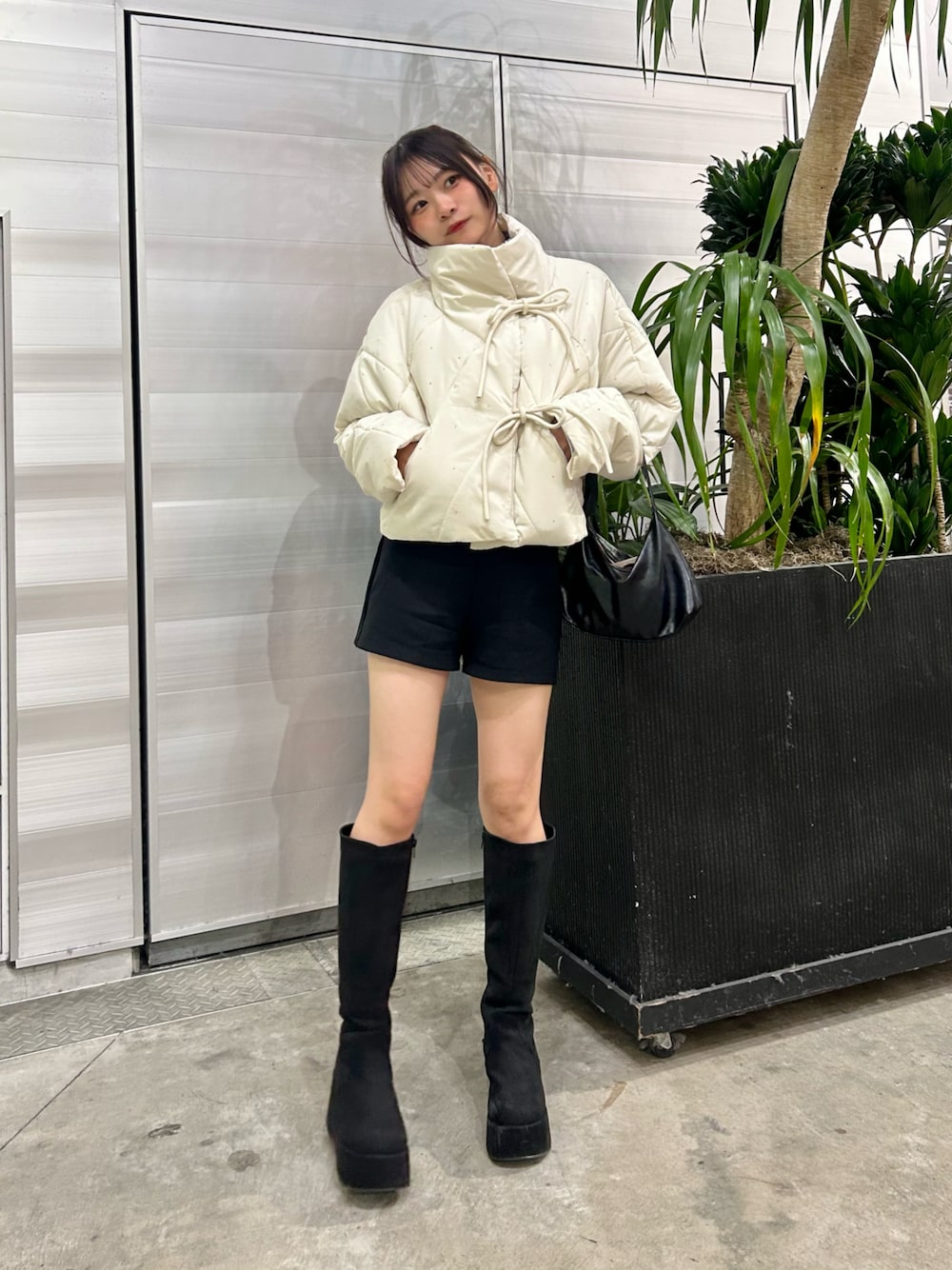 下半身を黒で合わせてちょっと肌見せしたら細見えだし、ロングブーツで脚長効果😚♩