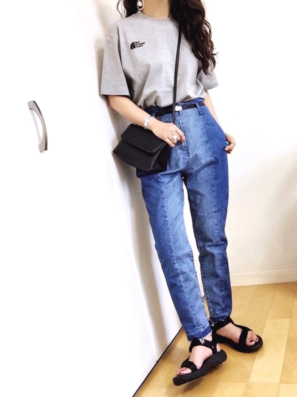 Tシャツは前回の着回し♡♡ デニム合わせ♡♪ イヤリングを ちょっとレトロ感あるやつにしてみました♪♪ # ロゴT THE NORTH FACE # テーパードデニム SENSE OF PLACE # スポサン teva # ショルダーバッグ OZOC # ベルト TODAYFUL # ビッグパールリング WEGO # フープイヤリング Shelly island # メタルバングル GRL