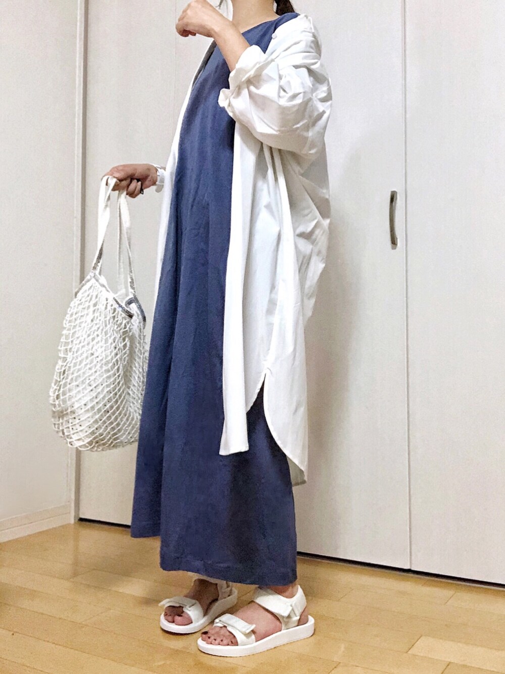 990円やったUNIQLOワンピ♡ ブルーも一緒に買ってました💕 肌寒かったから OZOCのパーフェクトフォルムロングシャツを羽織り♪♪ バッグは持ち手と中袋にスパンコール✨ イオンの通路で水着売ってるとこで見つけたものです♡♪