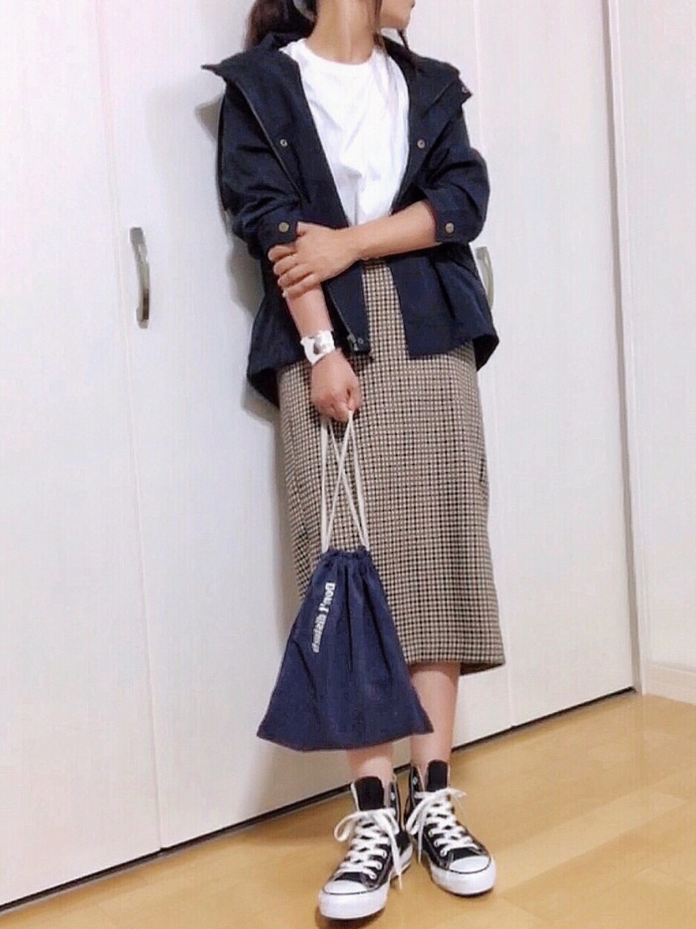 GUのガンクラブチェックスカートに マンパ羽織り♡ マウンテンパーカー めっちゃ使えるアイテム!✨ ニット着ることも考えてサイズは38です♪