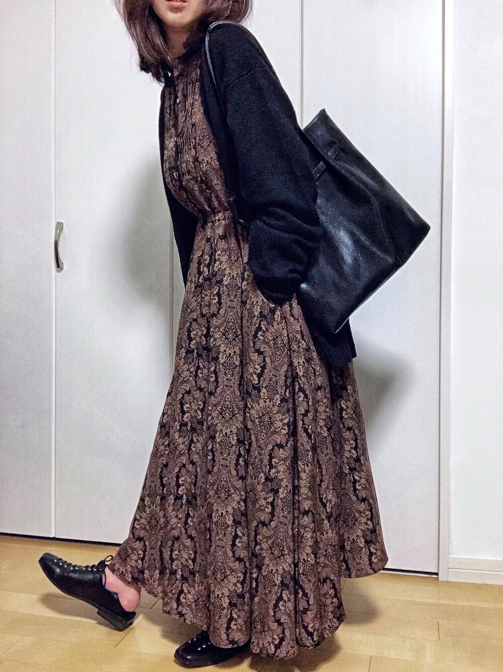 バンドカラーのダマスク柄ワンピで シンプルコーデ❤️ フレアもタップリです✨