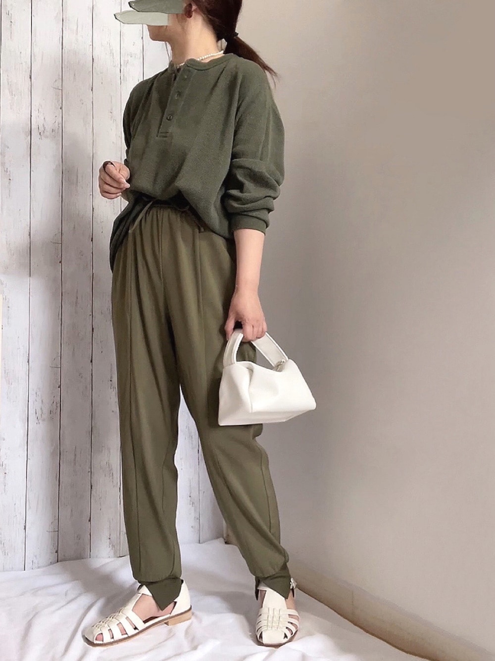 カーキとホワイト♡ なんだか肌寒かったから ワッフルカットソー。 パール等のホワイト小物で春感♪