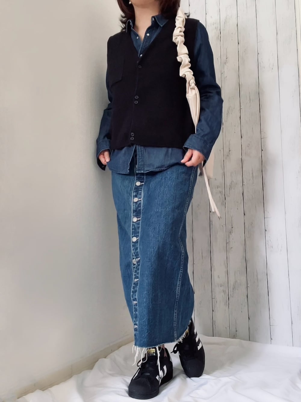 ギャザーを伸ばしても縮めても使える2wayバッグ♡ 柔らかくて外側にも大きいポケットが2つ付いてるからすぐに取り出したい物までサクッと入れておけます✨ 素材は雨の日でも気にせず使えます! 6色展開なんでチェックしてみてください♪ 現在大幅値下げのタイムセール中です❣️ デニム✖️デニムに ニットベストを合わせてみました♡ ニットベストは今899円になってます😊