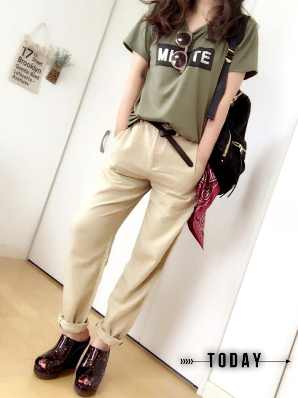 アースカラーコーデ♡ バンダナはGUの新色ワイン お尻側のベルトループに 1回通して垂らしてます♪ ずっといーなーって思ってたサボ♡ 痛いところ全然ないし ヒール高いけどウェッジなんで すんごい歩きやすいです✨ なかなか見ない色目にヒトメボレ😍 OZOCさん在庫×でも△になったりする事が ちょくちょくあるので小まめにチェックしてたら 在庫復活もあるかもかも?♪ ブラウンのベルトあたりと合わせてみました♡ サングラスはずーーっと前に買ってたやつw チノパンはメンズ物なんで しぼりロールアップしてます\(^o^)/ 品番ブログに書いてます♡ GRLのTシャツはとろみ系です! 前だけINしてます♪ ワイルドっぽくしたかったから 髪ワシャワシャww #ボックスロゴT GRL 999円 #チノパンツ しまむら 900円 #ループベルト OZOC #バックパック LegatoLargo #バンダナ GU 590円 #サボ OZOC #サングラス 300円ショップ