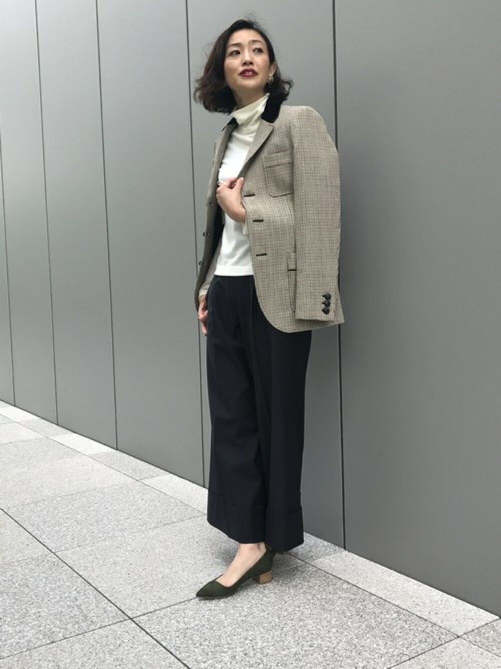 この秋注目のイギリスっぽいチェックをジャケットで取り入れてみました。インナーはシャツではなく、敢えてタートルにしてラフさを強調。少年のようになり過ぎないようにパールのイヤリングで女性らしさも演出しました。