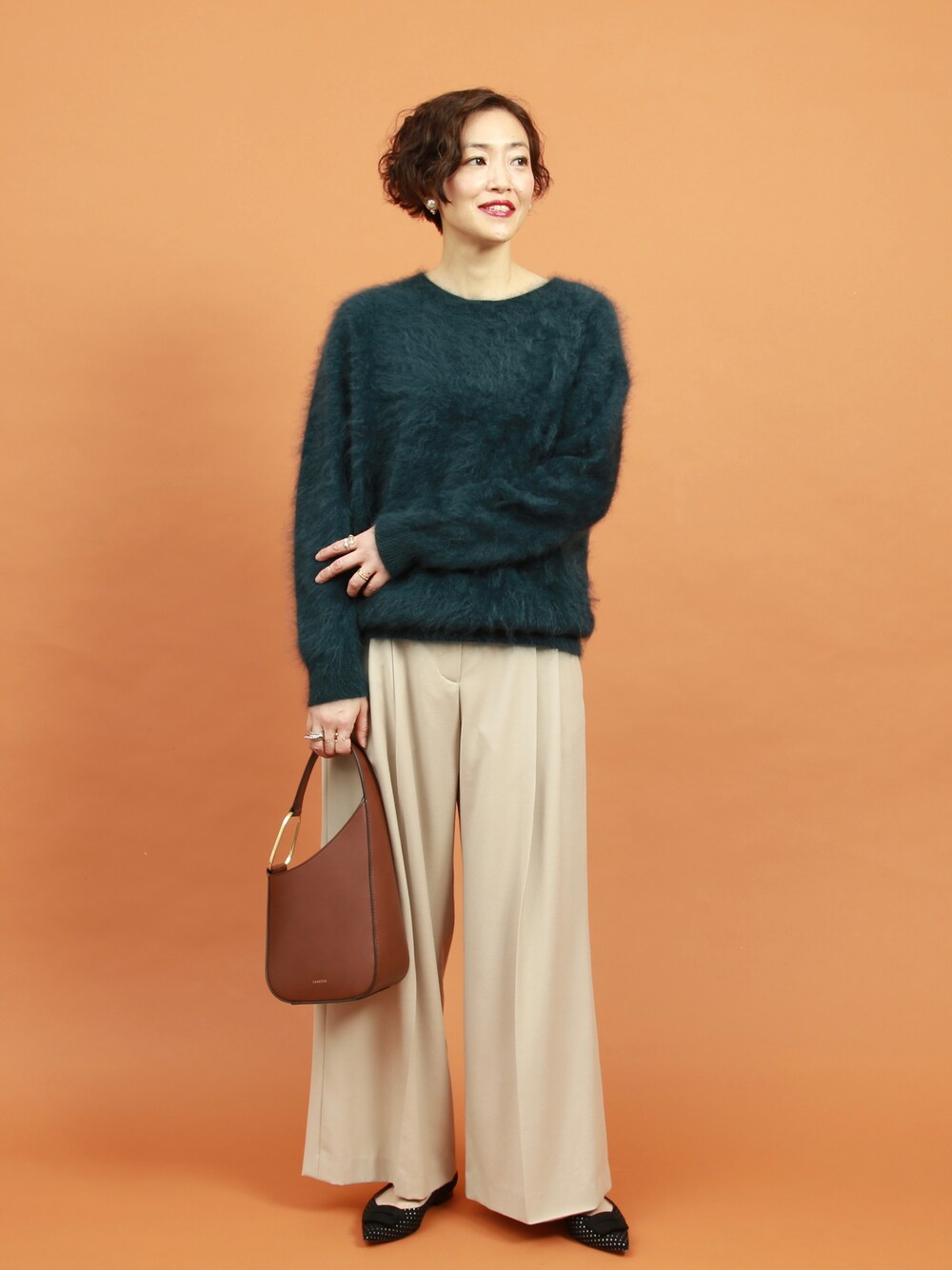 EFFE BEAMSのシャギーニット。グリーンがモダンな印象です。そのグリーンのニット+白っぽいベージュのパンツに黒のフラットシューズを合わせたコーディネート。柔らかなカラーのコーディネートに黒のシューズは一見きつい印象がありますが、シルバーのドットが施されているシューズなのでうまく引き締まっています。