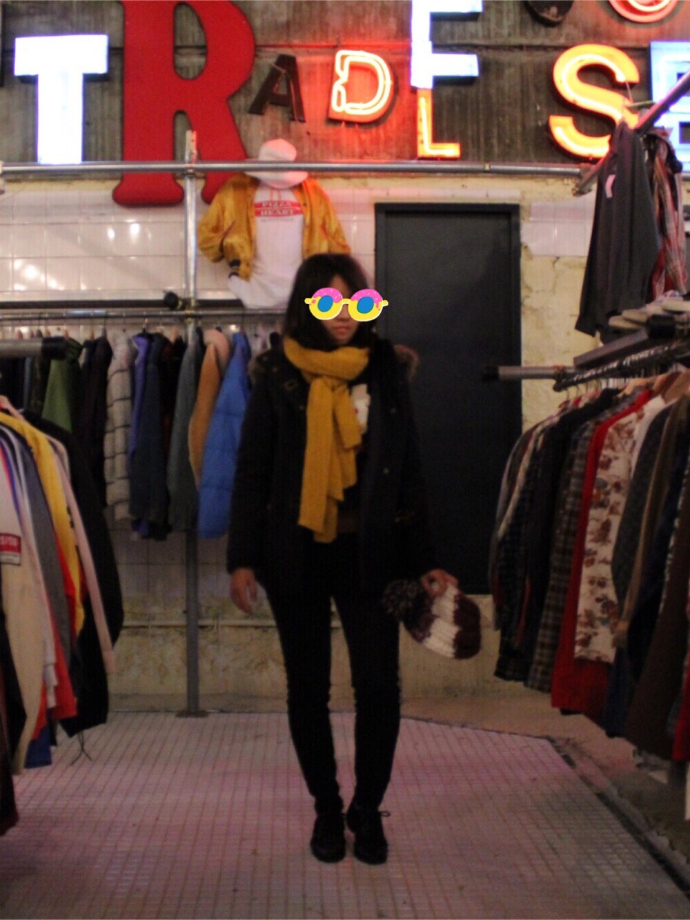 イエロー系のストール/ショールを着用したレディースの冬コーディネートの1枚目の写真