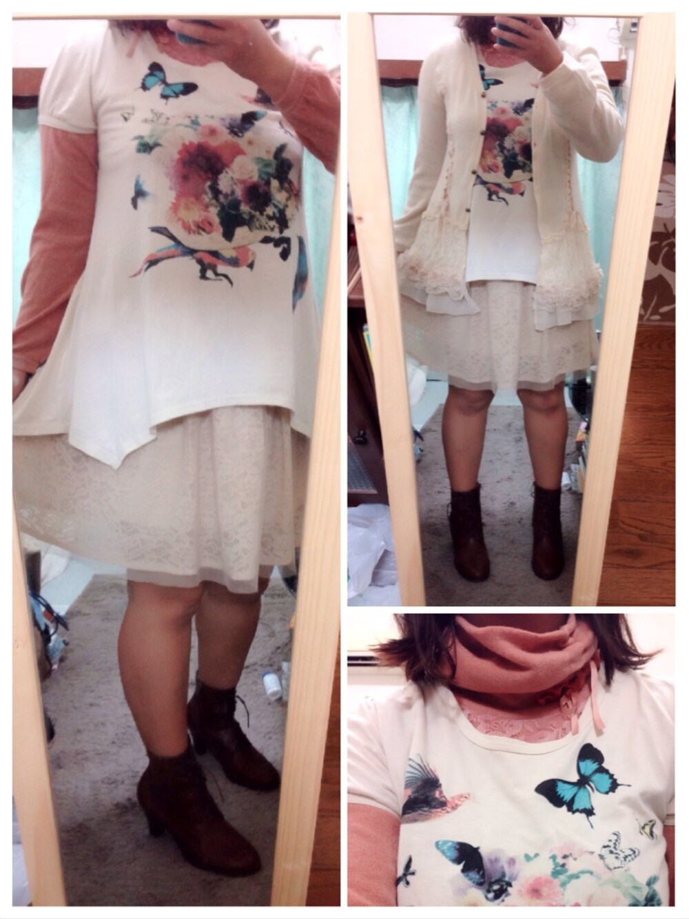 ゆるふわに恋して。 裾の左右が長くて真ん中が短い。 そんな不思議なTシャツが主役のコーデ。 ピンクオレンジのハイネックトップスをインしてそろそろ寒そうな半袖をカバー。 axesのカーデを羽織ったら 全身オフホワイトに差し色ピンクオレンジという印象に変身。 足元は買いたてのショートブーツでぴりりと甘辛に。 オフホワイトは優しい印象になるし可愛いからつい買っちゃうの。