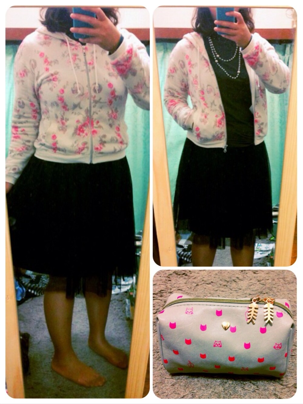 台風の勢いにどきどき。 トップス、スカート、パールネックレスは以前あっぷしたのと同じ物。 今日はパーカーを主役にしたかったの。 たしか去年か一昨年のモデルのUNIQLOのパーカー。 グリーンゲートとのコラボパーカーも可愛くて、そんなにいらないのに両方買っちゃったんだったかな。 ピンクの花柄に弱いのは女の子みんな共通だよねっていう言い訳。 先日写真右下のポーチをげっと。 猫モチーフのポーチで、ジッパーの掴むところまで魚の骨になってて一目惚れ♡ 可愛いよね ´ ` * 今度グリーンゲートのパーカーも着たいな*+.