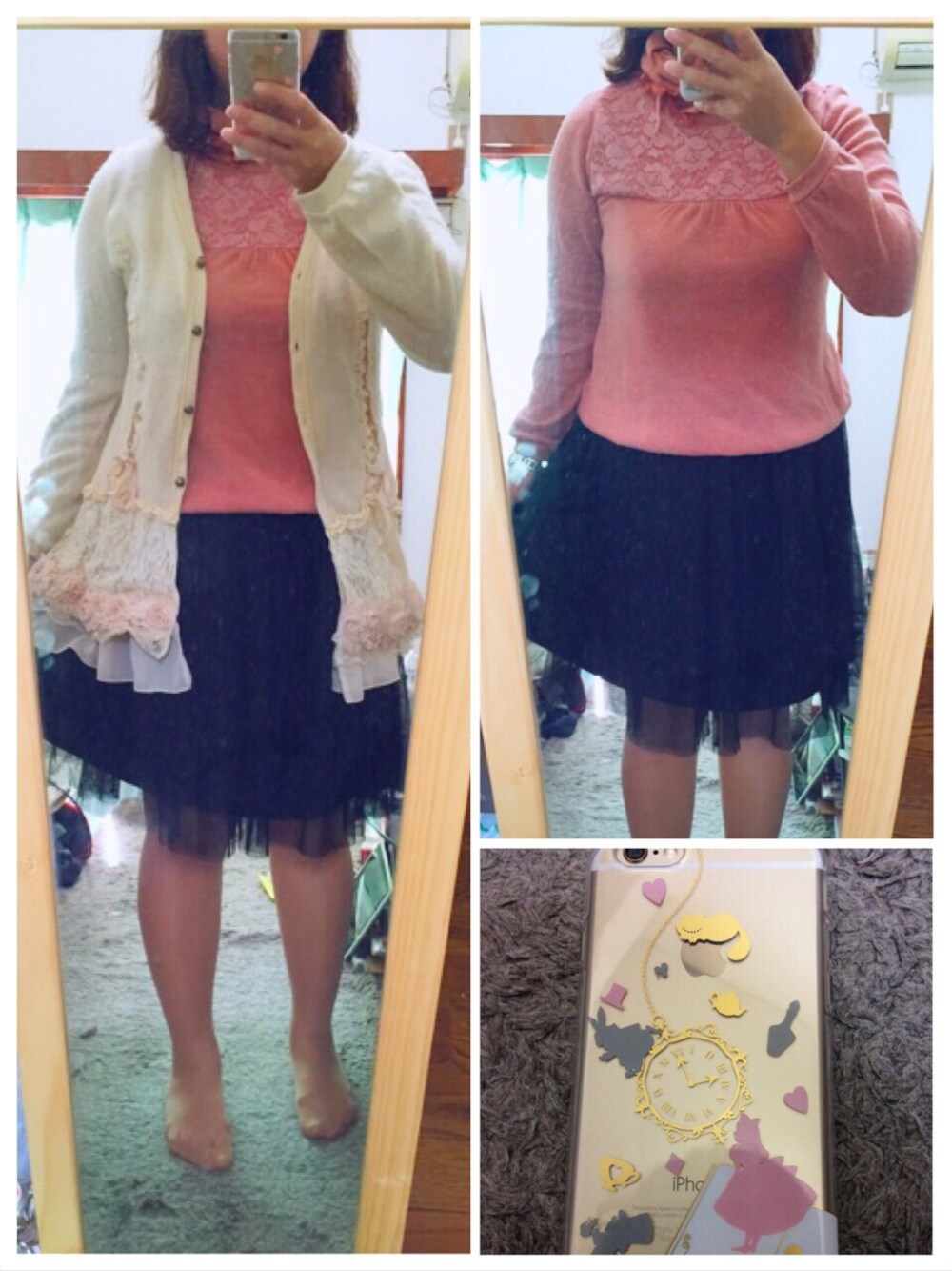 あんまりにもシンプルなコーデ。 トップスとカーデ、そしてショートブーツは4日とまるまる一緒。 さすがにスカートまで一緒はちょっとなぁと思い、黒のチュールスカートに。 と、気づけばほぼ黒チュールスカートコーデになっていて反省。 お洋服少ないからすぐネタ尽きる。。 あと、前回キャスキッドソンて書いちゃったけど、グリーンゲートでした。 さすがに放置できず修正。 最近勘違い多い…(´・ω・`) 写真右下のこと。 iPhone6買いました♡ ひとまずゴールドがいかせるケースということで透明のアリスのカバーに ´ ` * 設定が大変で、一昨日買ってから昨日の夜中まで使えない状態だったの(><;) 使えるようになってよかった*+. ということを書きたくて たいしたコーデでもないけど投稿 ´ ` *
