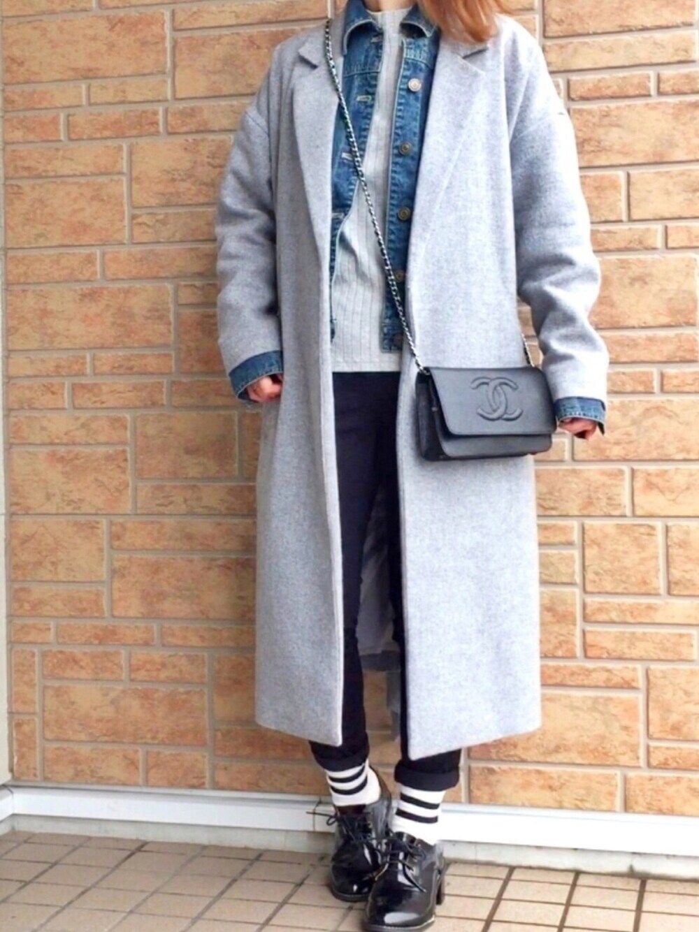 さむさむさむさむ:;(∩´﹏`∩);: お気に入りのガウンの下にGジャンコーデ⭐️⭐️ ラインソックスが見えるように ロールアップしてます⭐️⭐️⭐️ Gジャンは古着屋さんでゲットしました✌️💕💕