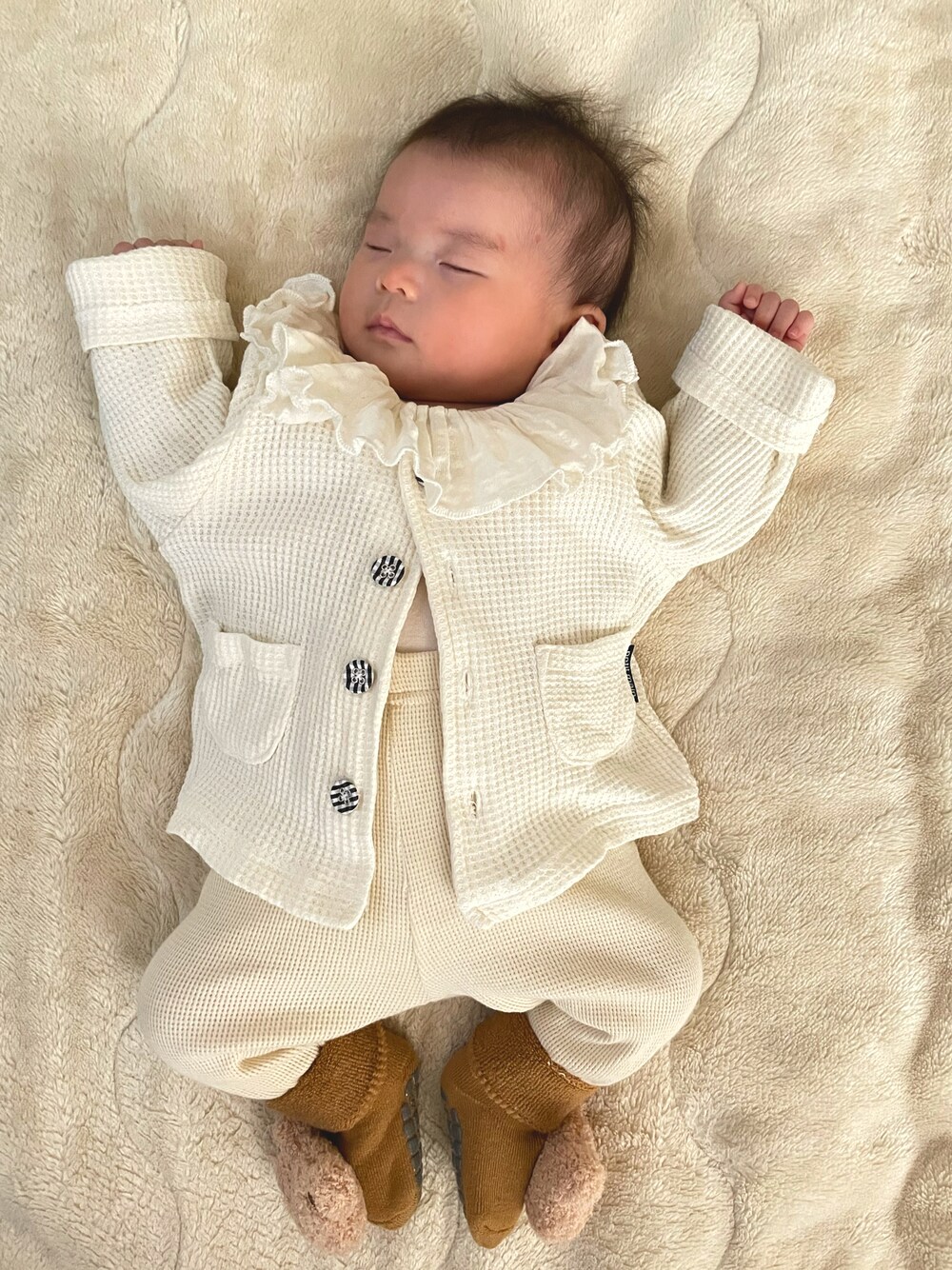 今日は初めてのカーディガン🌱 中のフリフリの襟を出して♡ 着替えてるとき爆睡で全く起きず、、されるがままの娘っちです🧑🏻🦲
