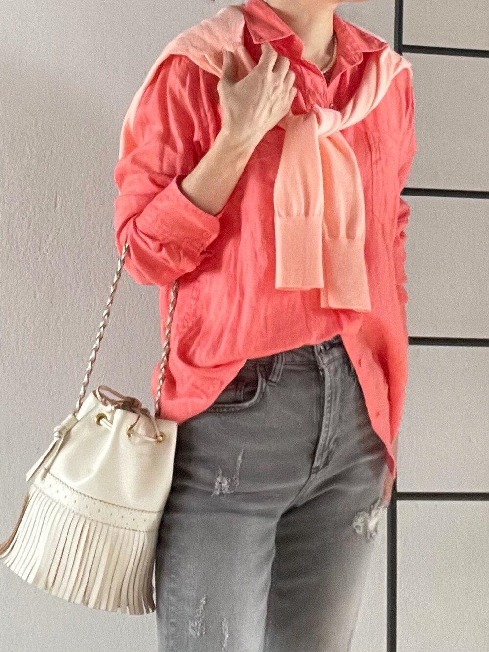ご覧頂いてありがとうございます😌 ピンクのグラデーションコーデです♪ この時期はリネンシャツを着ることが多いです😊