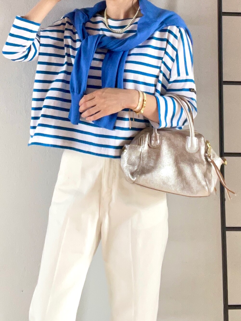 おはようございます😃 ブルーボーダー×ホワイトデニム UNIQLOのカーディガンを肩掛けしてバイカラーの爽やかコーデにしました🎶