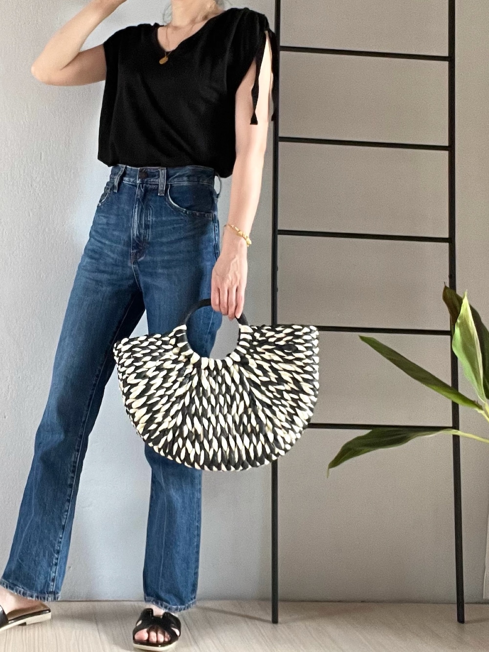 おはようございます😊 お気に入りのカゴバッグメインコーデです。 ブラックコーデでシンプルにしました😊
