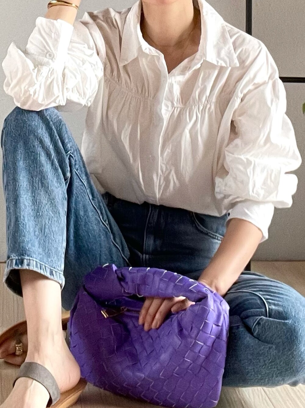 おはようございます😃 白シャツ×デニムの定番コーデ♪ ノーブランドですが、ギャザーデザインブラウスはお気に入りです💕