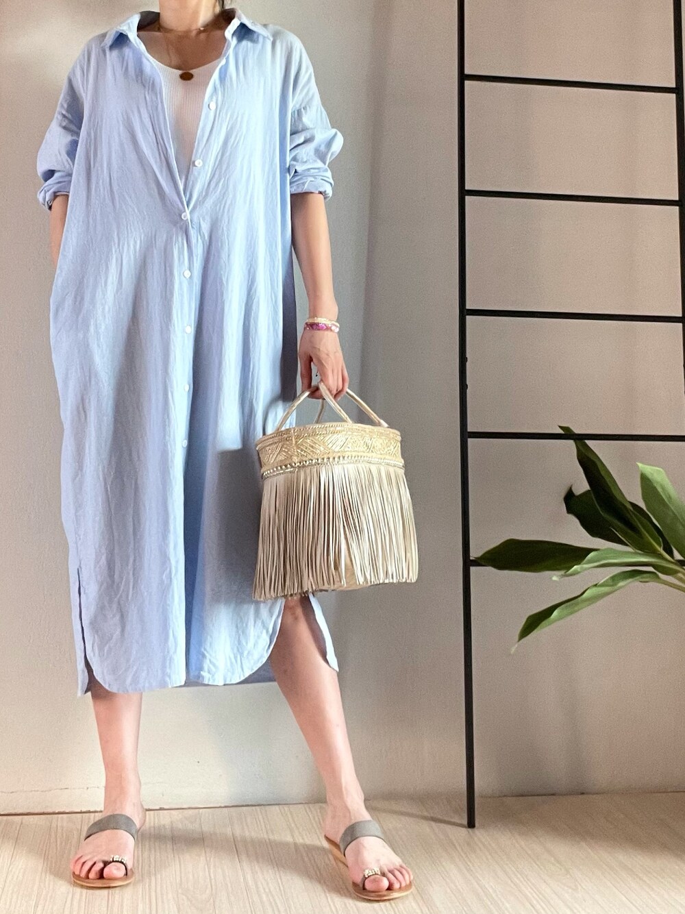 おはようございます☀ お気に入りのフリンジカゴバッグとシャツワンピコーデ♪ ワンピの下にはパンツを履く事が多いですが暑過ぎてサラッと一枚で着ちゃいました😅