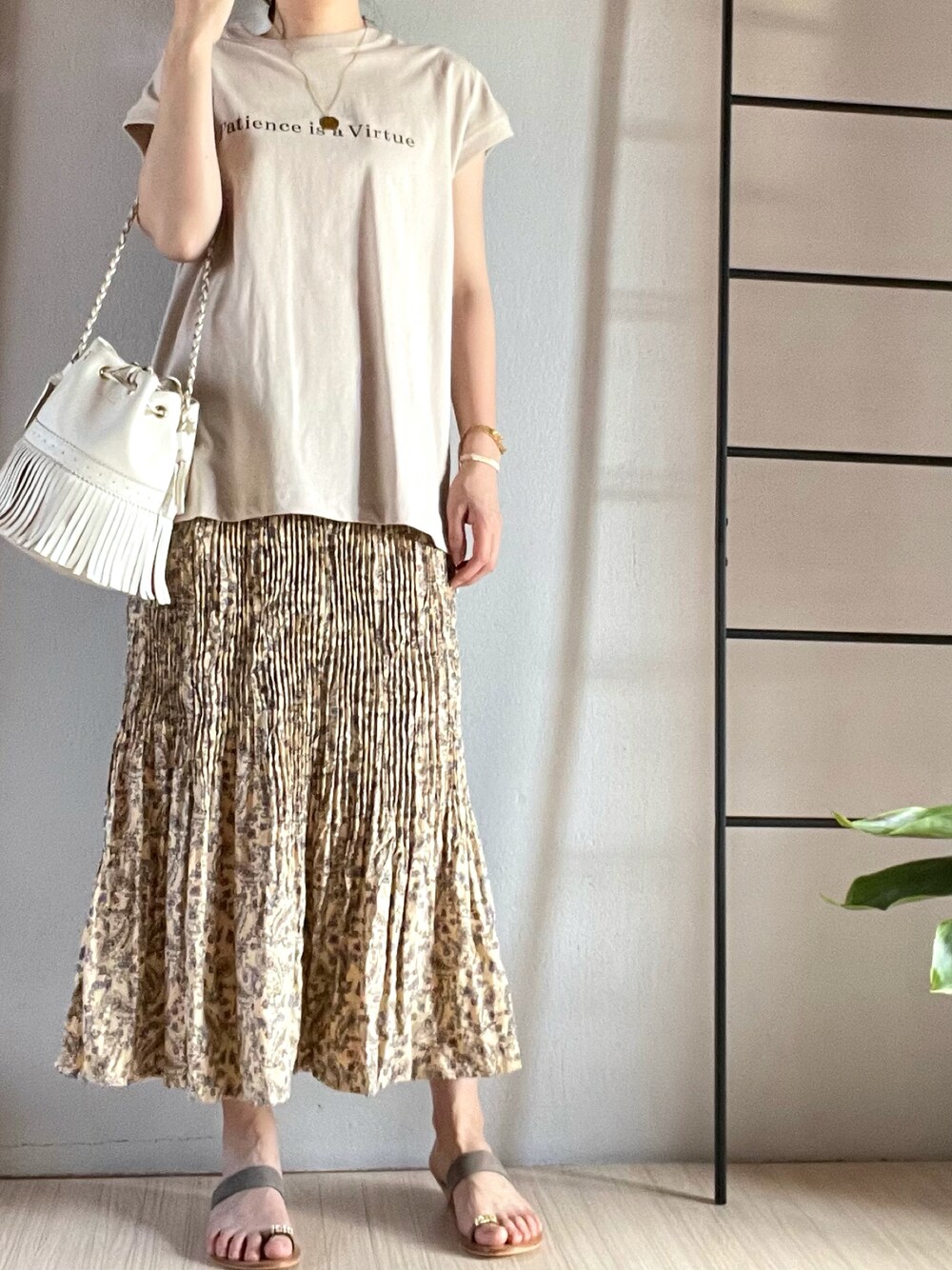 おはようございます☀ プチプラ淡カラーコーデ♪ 昨年のUNIQLOプリーツスカートとmoment+ Tシャツでエクリュワントーンにしました♪
