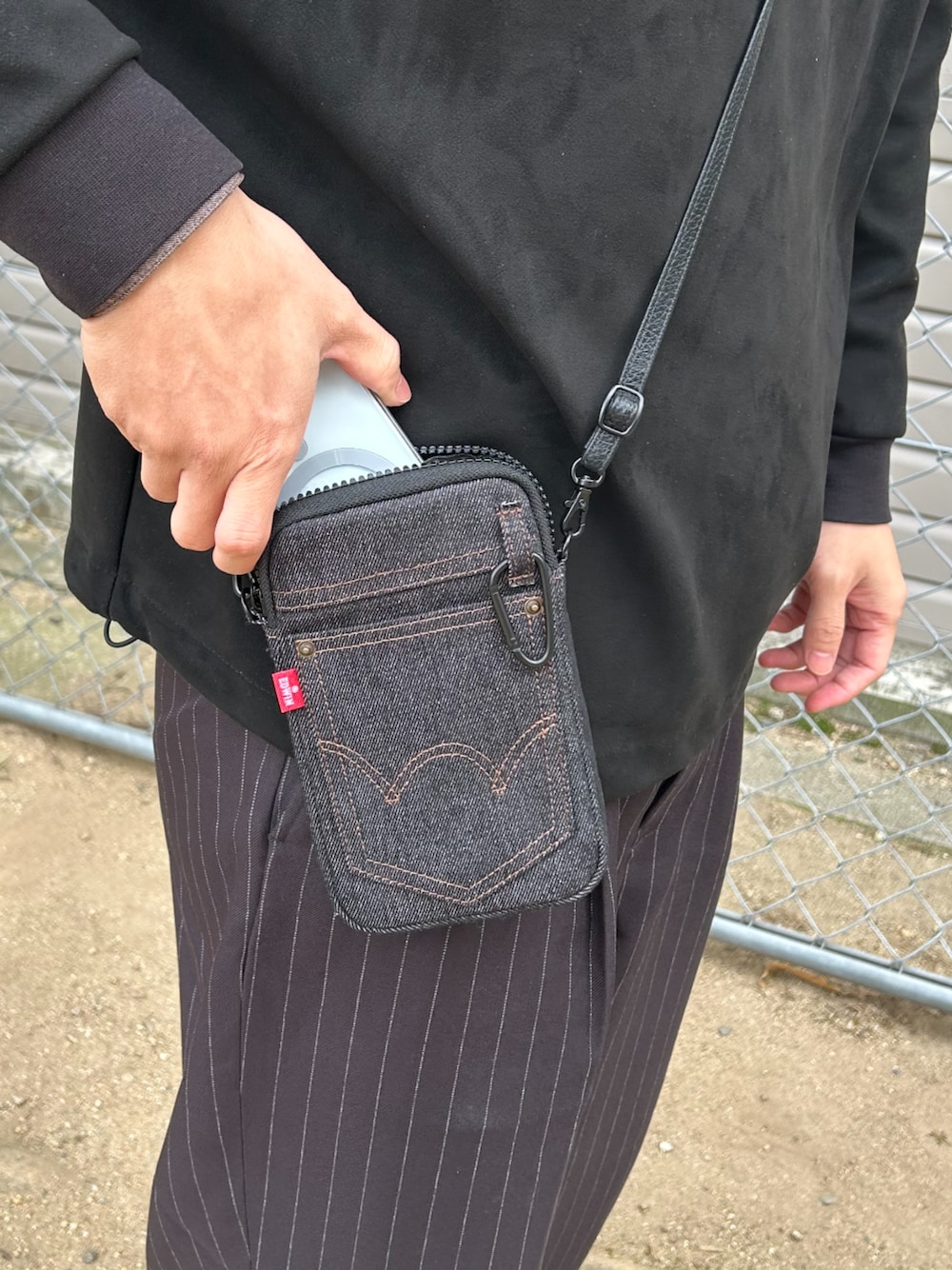 mfactory(企画販売部)のスマホグッズ「デニム ポーチ エドウィン 「スマホ用マルチポーチ」 ショルダーストラップ付き スマホポーチ カラビナ」を使ったコーディネート