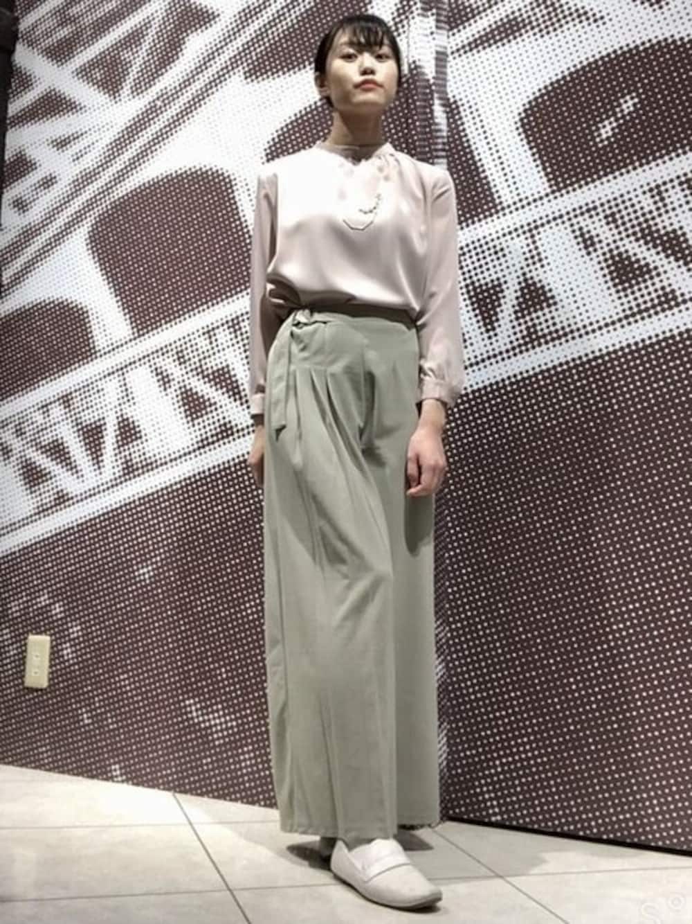 淡い色でコーディネートしました。 パンツのプリーツとフリルがゆったりと着こなせるので長時間でもストレスフリーです。 オフィスカジュアルにもぴったりです! m.f.editorial 浦和美園店