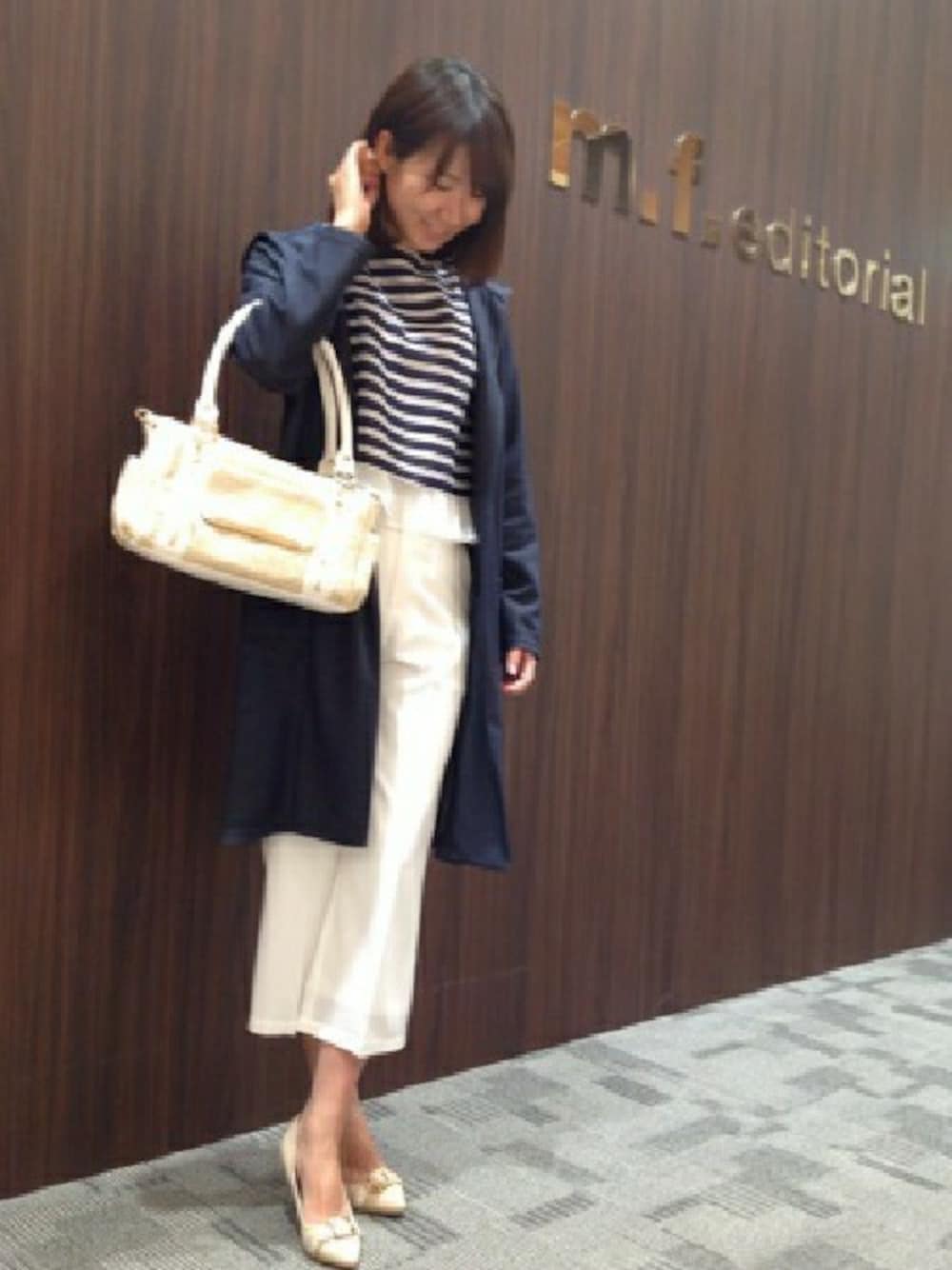 トレンドのワイドパンツに、着丈短めのフリルボーダーで爽やかさ倍増!! サッと羽織れるロングカーデは一枚あると本当に重宝しますよ(^◇^) ホワイト×ネイビーの鉄板コーデ、ぜひお試しください(^ω^)