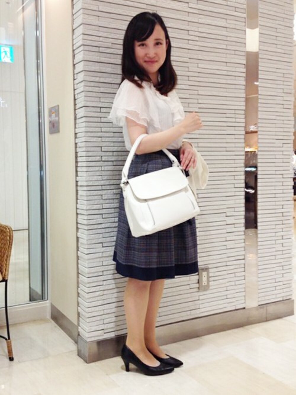 フワッと大人可愛いデザインスカート、フェミニンで清楚なシフォンのドレスシャツ、眩しい白ジャケット。 この人の周りだけ涼しい風が吹いているような、晩春〜初夏のお出かけにぴったりなコーディネイトです。