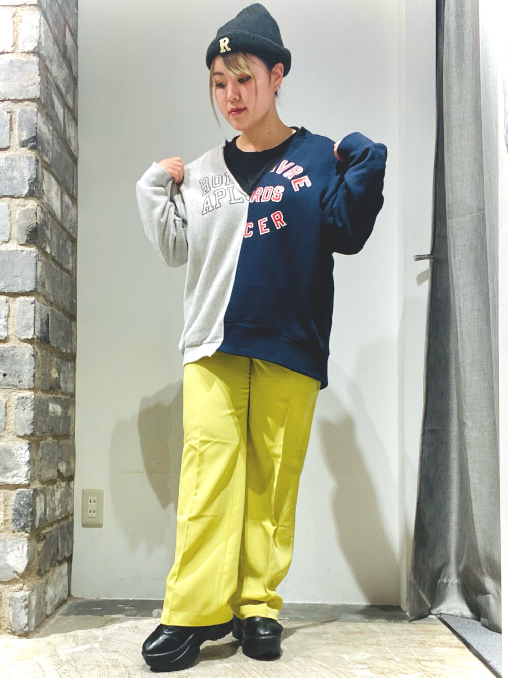 スウェットとカラーパンツコーデ💛 ニット帽子と合わせると ストリート系ファッションに!!