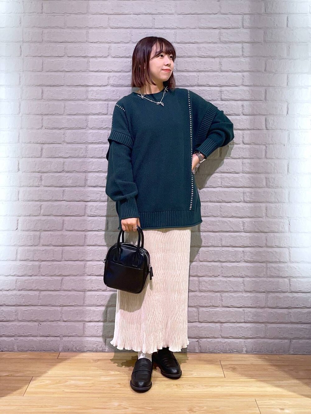 【ニット】 前後どちらを前でも着用できるニット! ステッチのデザインがポイントになってかわいいです♡ ショート丈とロング丈の展開があり、私はロング丈を着ています! ロング丈はお尻周りまで隠れるくらいの丈感で安心◎ 前だけインするとショート丈のようにも着れるのでおすすめです✨ 【スカート】 光沢感のあるベロア素材のタイトスカート! タイトスカートですが、ストレッチ性があり、ウエストゴムなので楽に着れます! 裾のメローデザインもポイントです☆