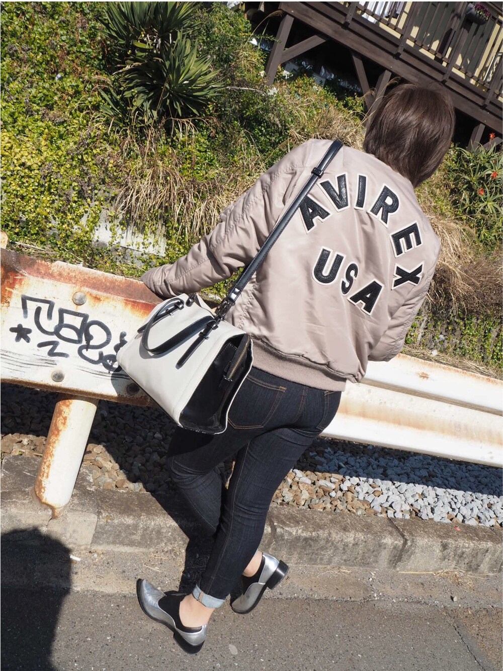moussyとAVIREXのコラボ商品のMA1とデニムは今期発売のEMOTION DENIM。足元はstaccatoのローファーです。