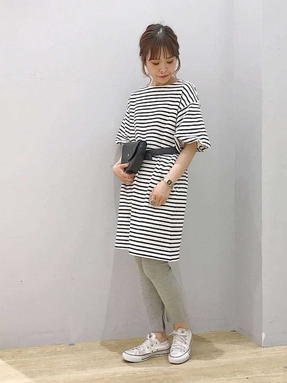 お袖がかわいいボーダーワンピに、新作のウエストポーチ巻いてみました🙆♀️