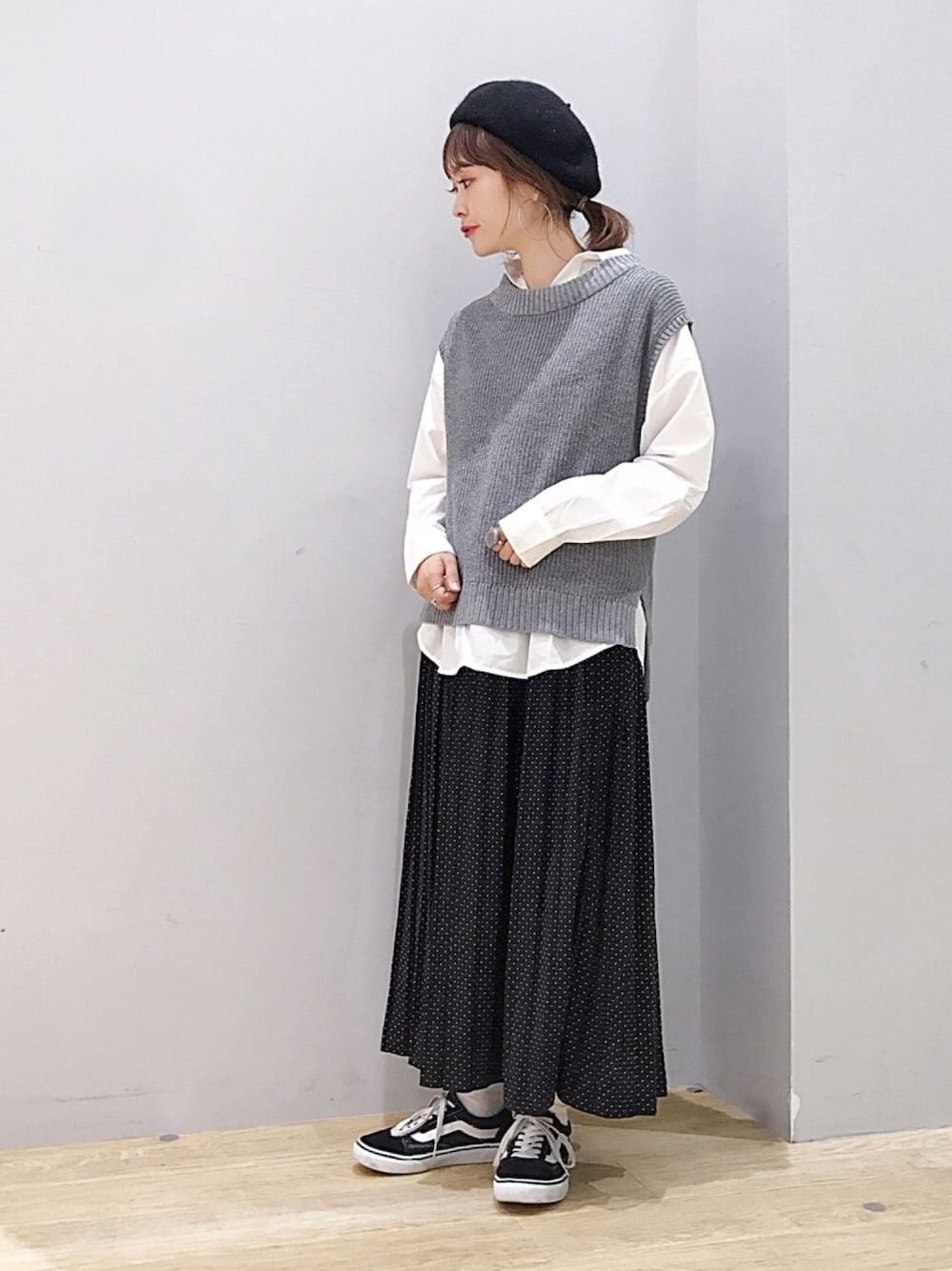 ベストときれいめシャツのセットは、プリーツスカートとスニーカーでカジュアルに合わせました。
