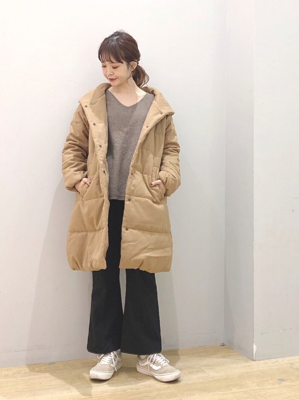 ぐちょめ(earth music&ecology)のその他アウター「ショールカラーロング中綿ブルゾン 〇*」を使ったコーディネート