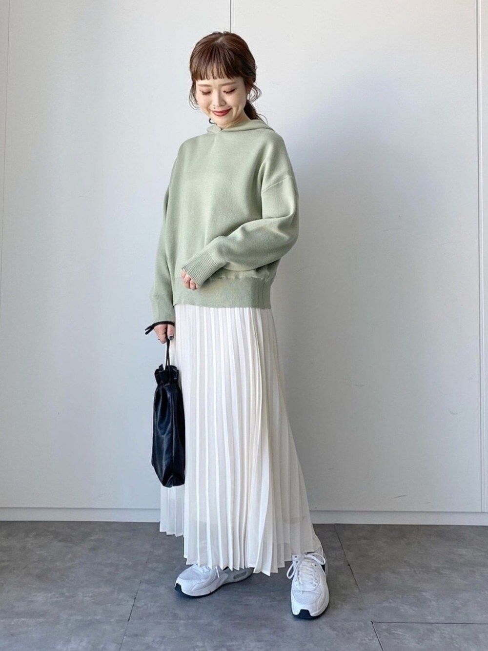 トップスはフード付きですが、ニットなのでスウェットパーカーよりもキレイめな印象になります。