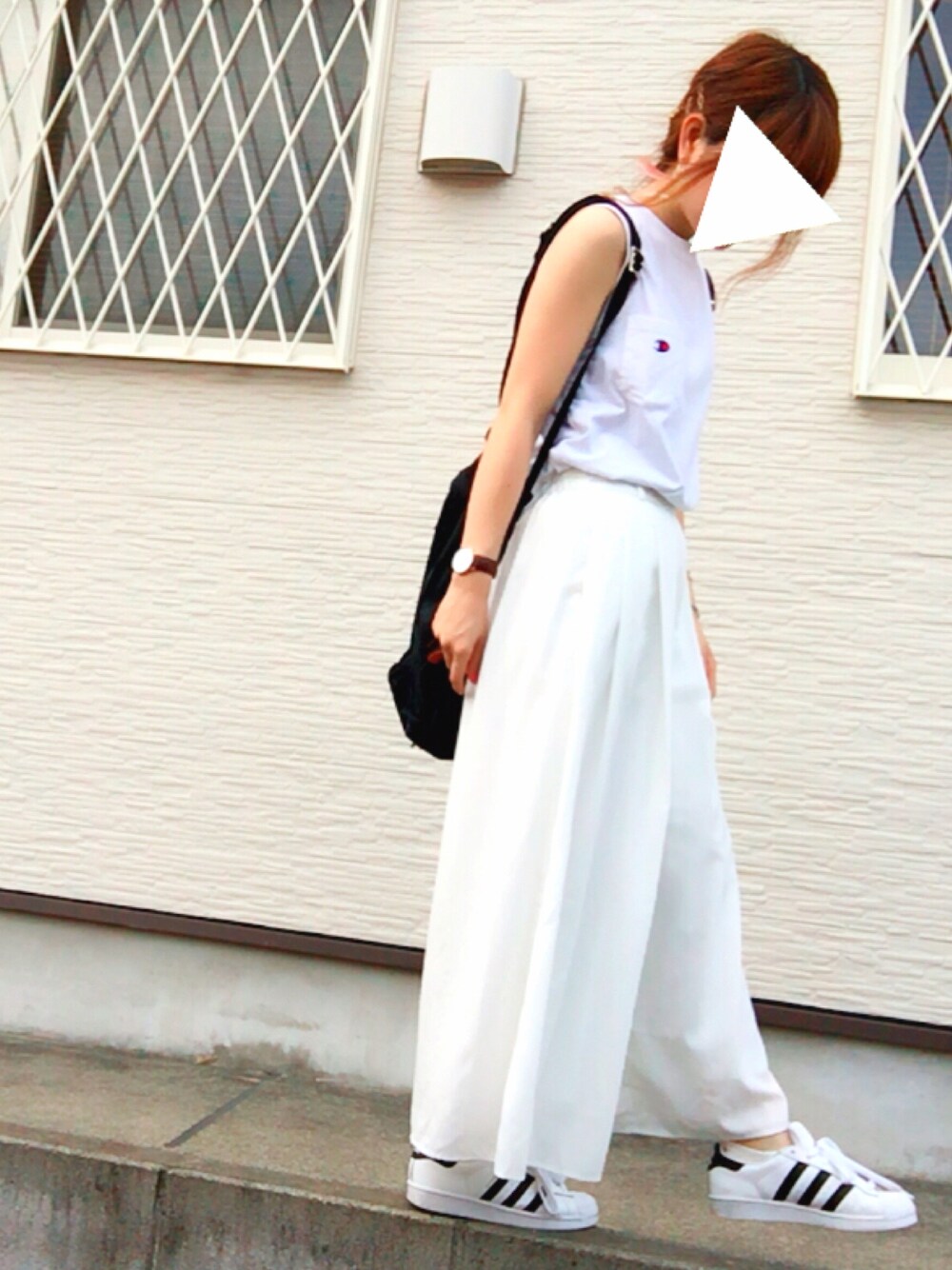 ホワイトコーデ🐻🌷 靴とリュックで黒をプラスして ぼやけないように٩(*´︶`*)۶҉ チャンピオンのノースリーブ探してて 探し求めてたものと出会えました😭💕 胸元のポケット部分にロゴが付いてて可愛い\( ´ω`)/✩°。⋆ 今日は雨ですね☔️! じめじめしますが笑顔で頑張りましょ〜💪⭐️ 今日も見てくださってありがとうございます♬