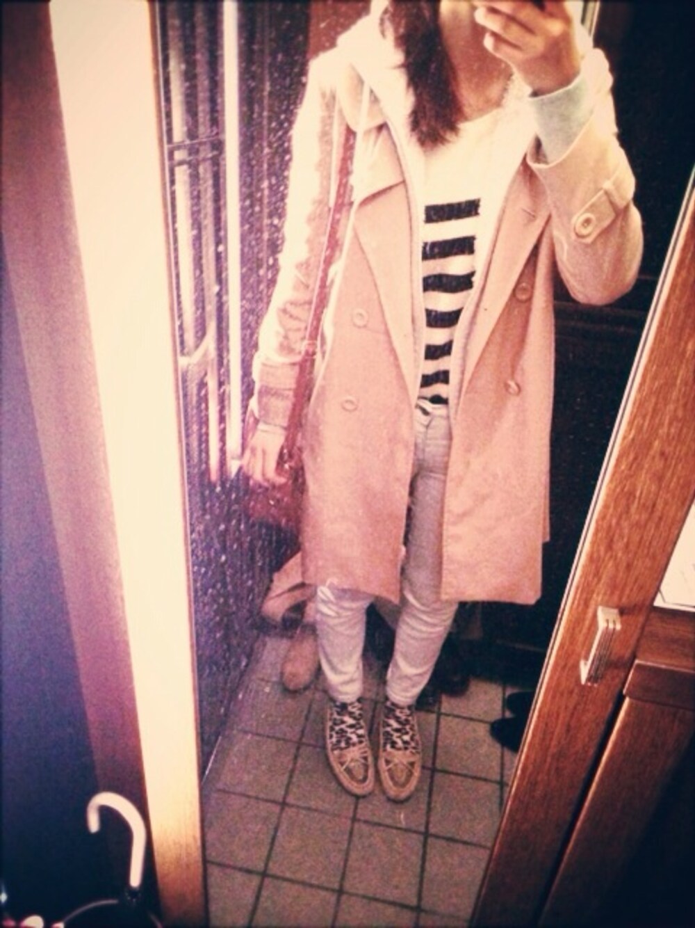 トレンチコート:ノーブランド パーカー:UNIQLO ボーダーニット:earth music&ecology 靴下:雑誌付録 靴:REZOY 地元ぐるぐる車で家族とお買い物ツアー! 鏡がきたなくてすいません。